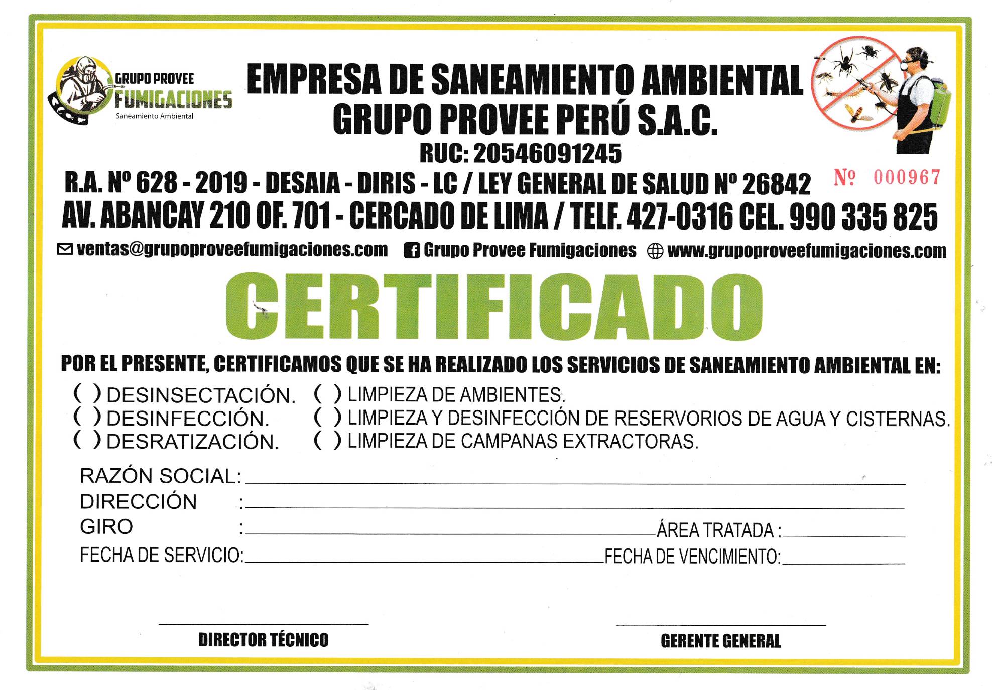 Todos nuestros Servicios de Saneamiento Ambiental (fumigación) incluyen CERTIFICADO, documento que es exigido por las autoridades como las Municipalidades, Defensa Civil, Sunafil, Ministerio de Salud, etc.